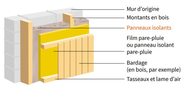 Principe de l'isolation sous bardage - Source : Ademe